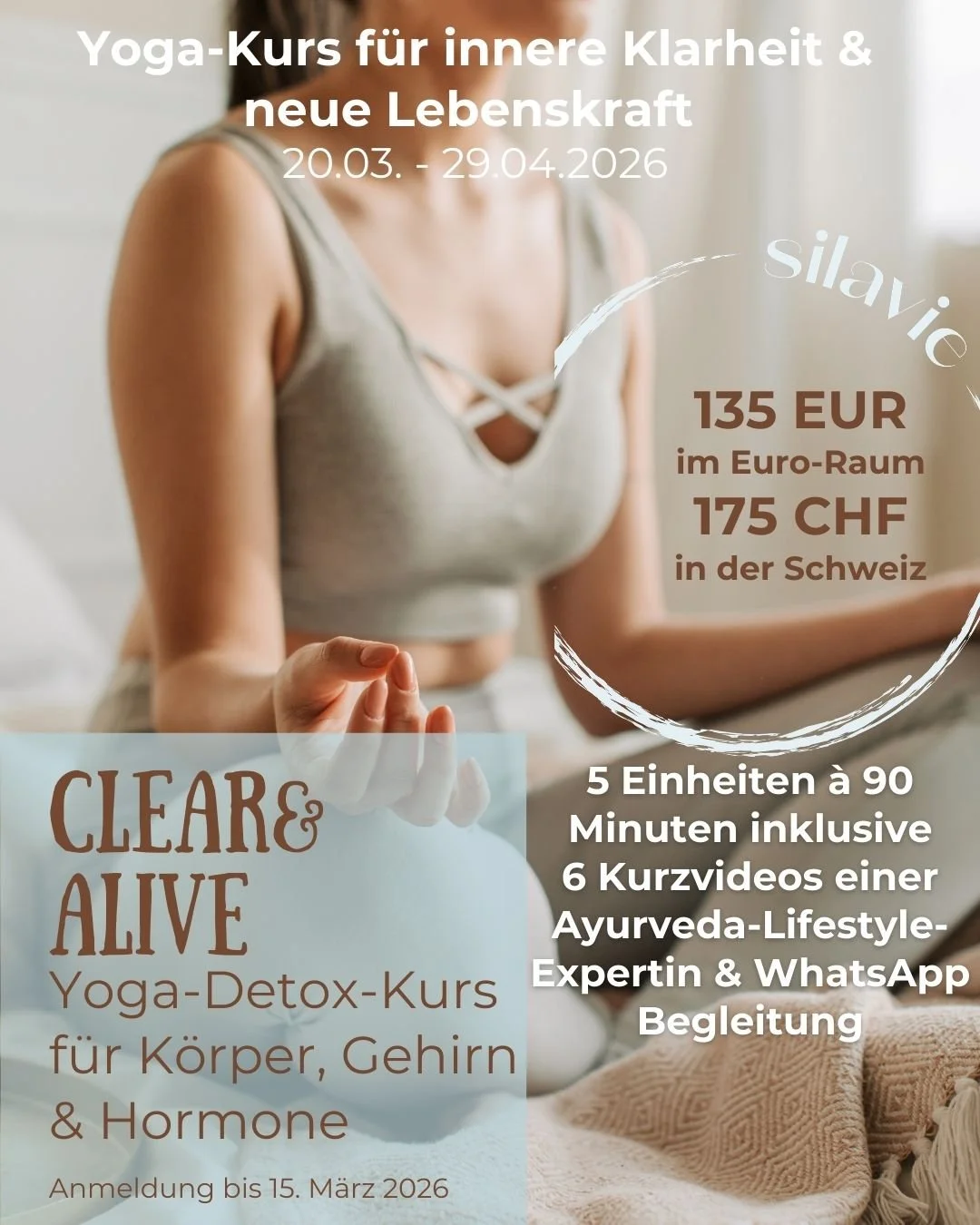 Ab dem 20.3.2026 startet eine wunderbare Co-Kreation mit der lieben Judith von mindyama.com. Ein moderner Yoga-Detox Kurs in 5 Teilen, der wirkungsvolle Yogaeinheiten, ayurvedische Impulse und Körper-Wissen vereint.